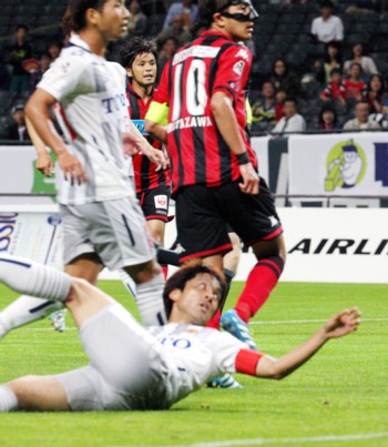 上写真/後半6分、札幌MF宮澤(10番)と北九州MF風間(7番)、キャプテン同士のマッチアップ。後方左DF増川、右端GKク・ソンユン