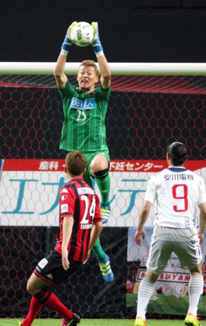上写真/後半12分、北九州のシュートを札幌GKク・ソンユン(25番)がジャンプしてキャッチ、手前DF福森(24番)、右北九州FW原(9番)