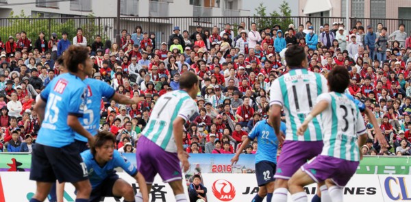 上写真/7月3日、函館市千代台公園陸上競技場で行われた北海道コンサドーレ札幌対横浜FCの試合は、5年ぶりの函館開催となった。試合開始前、ゴール裏サポーター席に“函館も盛り上げようぜ!”の横断幕が掲げられた