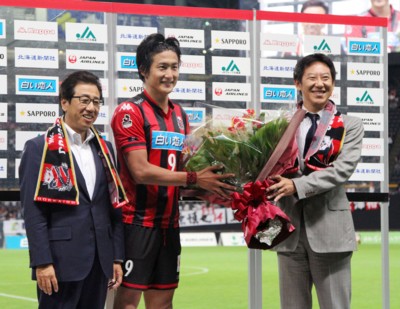 上写真/スポーツ庁の鈴木大地長官が札幌―松本山雅戦を視察、試合後、このゲームのMVP賞を受けた札幌FW都倉(9番)に花束を贈呈した(右)。左は秋元克広札幌市長