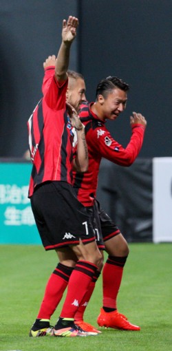上写真/後半30分、ハットトリックを決めた札幌MFジュリーニョ(左)が結果的にアシストとなったMF中原(右)とハイタッチして喜ぶ