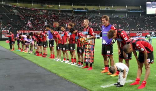 上写真/岐阜に勝利し場内を一周した選手たちと一緒におじきするマセード選手の子どもに場内から笑いが起こった