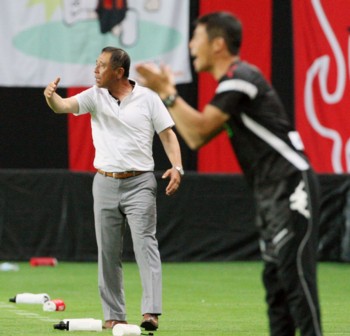 上写真/後半追加タイム1分、2−2の展開で懸命に指示を出す札幌四方田修平監督(右)と清水の小林伸二監督