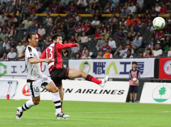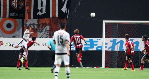 すると後半31分、清水に追撃のゴールを許す。清水が細かいパスワークから、河井がゴール前へクロス。これを鄭が頭で合わせ強烈なヘディングシュート。一度はクロスバーにはじかれるも、途中出場のFW北川がこぼれ球にいち早く反応し1点差。勢いに乗った清水は後半39分、ついに同点とする。途中出場MF村田の右からのクロスに合わせたのがまたも鄭。ペナルティーエリア内で対空時間の長いジャンプからの強烈なヘディングシュートがGK金山の手をはじきゴール。終盤で2−2に追いつく。
