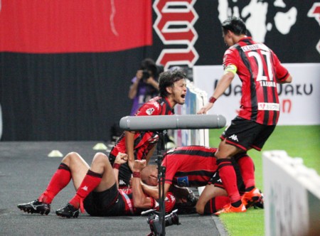 上写真/後半追加タイム4分、決勝ゴールを決めた札幌FW都倉はピッチの外に倒れこむ。その胸の上に顔をつけて祝福するジュリーニョ、石井が雄叫びを上げる。右端荒野(27番)