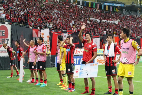 上写真/3−2で清水を下し、この日のMVP賞を獲得したFW都倉(右から3人目)ら札幌の選手たちが、後押ししてくれた1万7,000人を超える観客にあいさつ