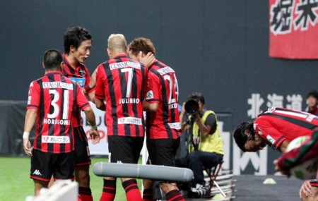 上写真/後半22分、札幌はオウンゴールで先制、最初DF福森(24番)のゴールとアナウンスがあり、MF堀米(31番)、FW都倉、MFジュリーニョ(7番)らが祝福。後になってオウンゴールと訂正された