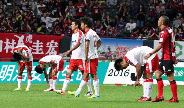 上写真/敗戦が決まり体を折ってガックリの熊本の選手たち。右端は途中出場してゲームをコントロールした札幌MF小野(44番)