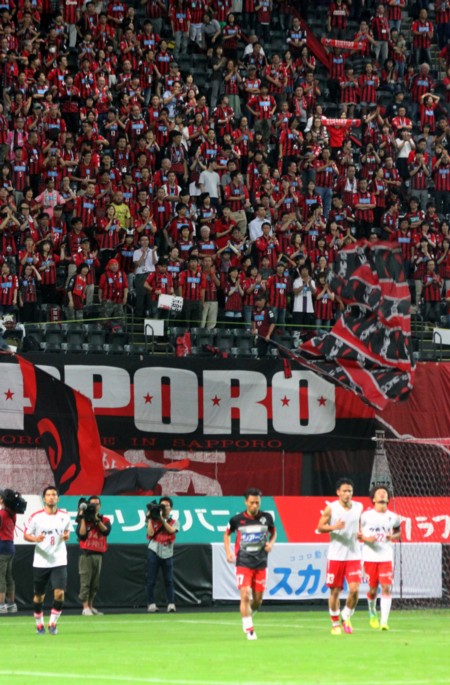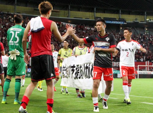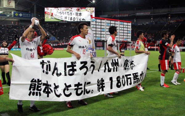 上写真/8月25日、札幌ドームで行われたJ2第12節、北海道コンサドーレ札幌対ロアッソ熊本の試合終了後、復興支援のお礼の横断幕を掲げて場内を一周した熊本の選手たち