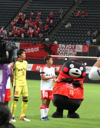 上写真/熊本のマスコットキャラクター「くまモン」もピッチに登場。後方は熊本から駆け付けたサポーターたち