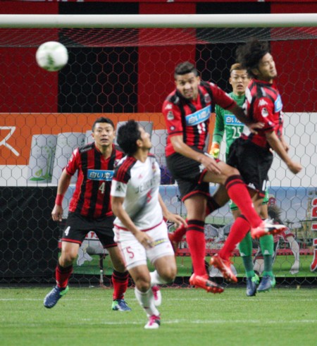 上写真/前半12分、金沢の右FKからの攻撃をはね返す札幌FWヘイス(11番)とMF石井(19番)。左端DF河合(4番)がベテランの味を発揮してチームを統率した。後ろはGKク・ソンユン