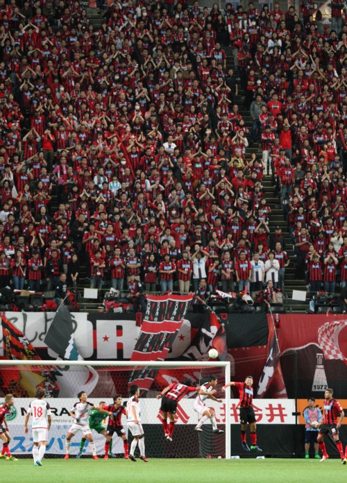 上写真/後半19分、金沢の右CKからの攻撃をクリアする札幌DF河合(4番)とFW都倉(9番)。この日、優勝と昇格を見届けようと詰めかけた33,697人の観客の後押しを受けた