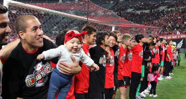 上写真/家族も一緒にサンクスウオークで場内を回る。左からFW内村、GK金山、赤池ゴールキーパーコーチ、FWヘイス、四方田監督、右端はけがでリハビリ中のMF稲本