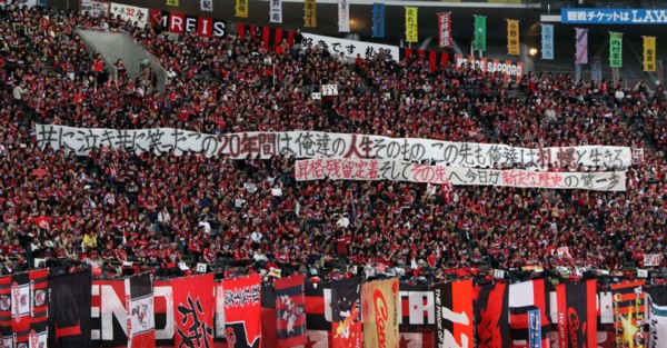 上写真/横断幕を掲げてJ2優勝、J1昇格を称える札幌のゴール裏サポーターたち