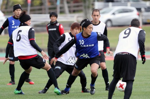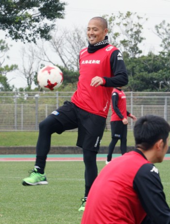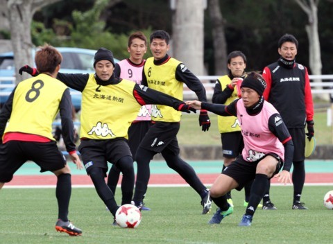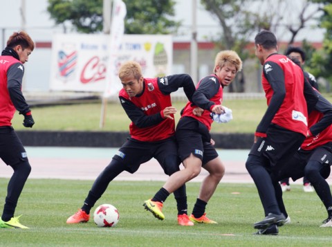 上写真/北海道コンサドーレ札幌は、J1の厳しい戦いに向けて1月16日から2月6日まで、沖縄県の金武町陸上競技場で強化キャンプを行った。写真は、1月30日、別メニュー組だがボールを奪い合う稲本(左)と深井、昨年の大けがからここまで回復してきている