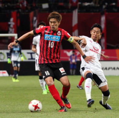 上写真/前半15分、ボールをキープする札幌MF宮澤(10番)に猛然と襲いかかるスペイン帰りのC大阪MF清武(46番)。清武はうまさは見せたが得点はならなかった