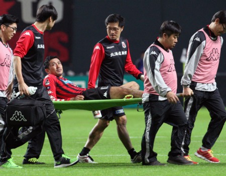 上写真/後半開始早々の5分、札幌FW内村が負傷してタンカに乗せられて無念の退場。前節負傷したジュリーニョに代わって今季リーグ戦初先発内村は、鋭い動きを見せていただけに痛い退場となり、また札幌に心配事が増えてしまった