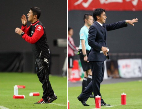 上:左側写真/後半33分、選手たちを鼓舞する札幌の四方田修平監督