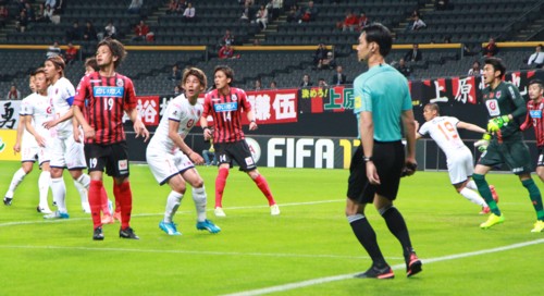 上写真/前半12分、札幌右CKからの攻撃時。この試合ゴール横に追加審判が付けられた。