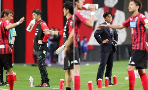 上:左側写真/後半13分、札幌MF宮澤の先制点の直後、気を引き締めるかのように厳しい表情を見せる四方田修平監督、左は水をとったMF兵藤