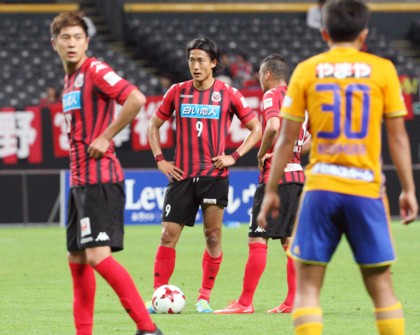 上写真/後半45分、札幌MF宮澤(左)が倒されて得たFKに、FW都倉(9番)、MFマセード(その右)がボールの所で話し合う。結局都倉が蹴ったがゴールならず