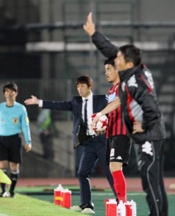 上写真/後半6分、札幌MF早坂のスローインの時、共に大きなジェスチャーで選手に指示を出す柏の下平隆宏監督(左)と札幌の四方田修平監督