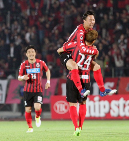 上写真/前半38分、先制弾を決めたDF福森(24番)に飛びついて祝福するMF荒野、左は笑顔で走り寄る早坂(26番)