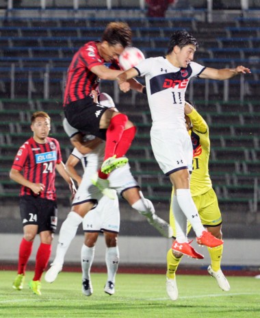 上写真/後半45分、札幌は右からFW上原があげたクロスをFWヘイス(中央)がヘッドで押し込み同点とする。左いわきのMF金大生(15番)