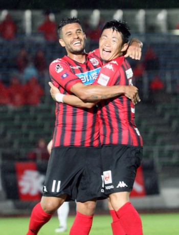 上写真/後半45分、同点弾を決めた札幌FWヘイス(11番)がMF菅と抱き合って喜ぶ