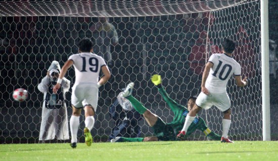 上写真/延長前半8分、いわきFW平岡(10番)がPKを決めて3度目の勝越しとなる。札幌GK金山、左いわきFW小野瀬(19番)