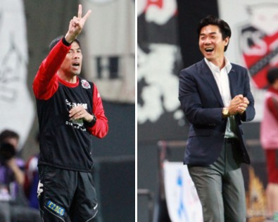 上:右側写真/前半追加タイム1分、サントスの先制点に笑顔で拍手するC大阪の尹晶煥監督