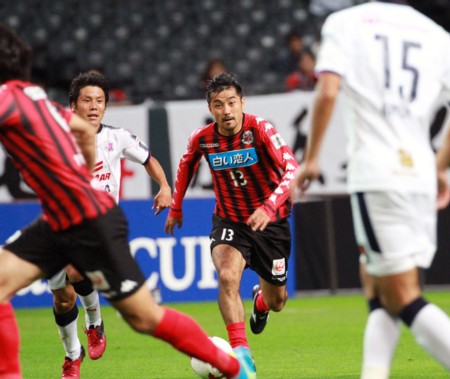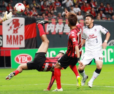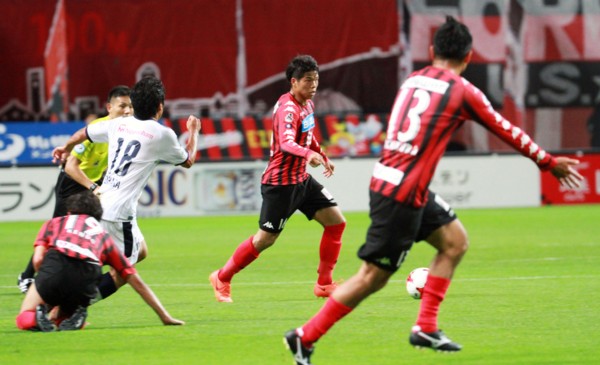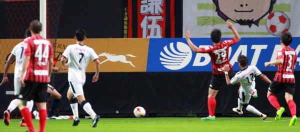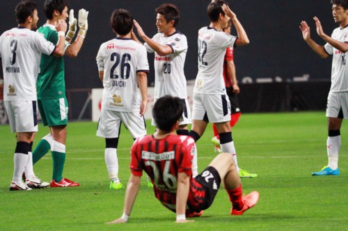 すると必然だったのか流れは大阪となり、前半終了間際の46分に先制を許す。大阪MF関口が左サイドのペナルティーエリア付近までドリブルで侵入。切り返して一度バックパスから関口がリターンパスをもらい、今度は左サイド奥深くからクロスを供給。これに走り込んで来たFWリカルドサントスが打点の高い強烈なヘディングシュート叩き込み、大阪1点リードで折り返す。