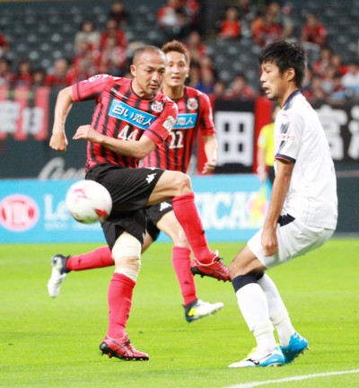 上写真/後半18分、札幌右からMF早坂の入れたクロスにFW内村が(左)がシュート、惜しくもクロスバーにはね返されたボールを内村が倒れたまま再びシュートするが相手DFにクリアされる。内村の右FW上原(14番)、右端C大阪DF茂庭(3番)