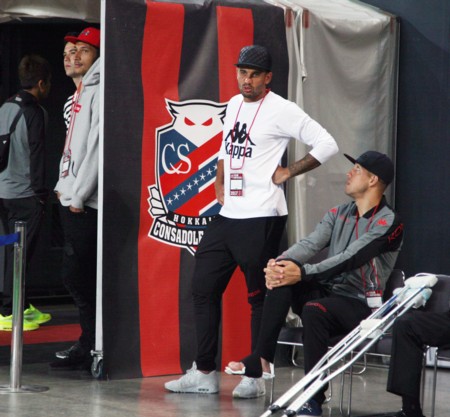 上写真/試合前に杖を横にアキレス腱断裂で痛々しい札幌FWジュリーニョと話すヘイス(中央)、左で新しく入団する予定の元イングランド代表FWジェイ・ポスロイド(赤い帽子)が選手の練習を見ていた
