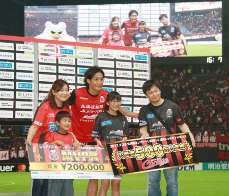 上写真/本拠通算入場者数が500万人に達し、東京・府中から来た小学2年生の小島叶大(かなと)君が、試合後、この日のMVPを獲得した都倉選手と一緒に記念写真に収まった