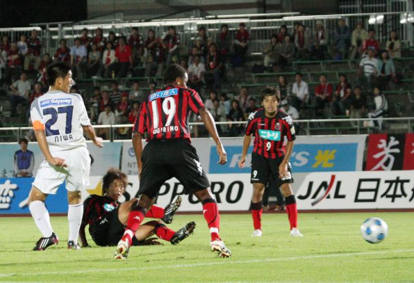 上写真/前半23分、コンサドーレ札幌は右サイドからMF古田からDF西嶋へとつなぎ、グラウンダーのパスを中央でFW宮澤が滑り込むように右足で押し込み先制点をあげる。右端MF石井(9番)、手前はFWキリノ(19番)、左は福岡DF丹羽(27番)