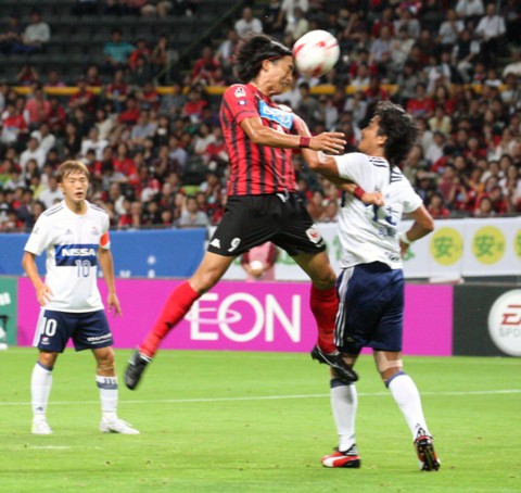 上写真/前半18分、札幌左CKからの攻撃でFW都倉(9番)がヘディングシュートするが決まらず、右は横浜DF中澤、左はMF齋藤(10番)