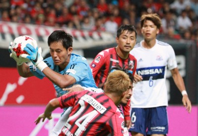 上写真/後半追加タイム2分、札幌の攻撃は横浜GK飯倉(左)にキャッチされ反撃ならず。中央右は途中出場した札幌FW内村、手前はDF福森(24番)、右端は先制点を上げた横浜MF扇原(6番)、内村と福森の間にDF中澤の顔が見える
