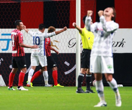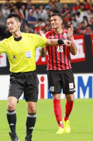 上写真/後半3分、札幌FWジェイ(48番)の追加点を狙ったシュートはわずかに右にそれ悔しがり、「スマン、スマン!」といった表情