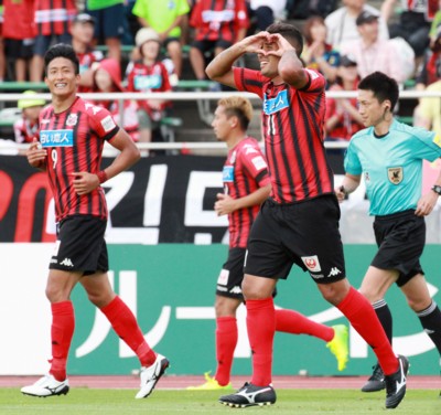 上写真/後半8分、先制ゴールを決めた札幌FWヘイス(11番)がハートマークを手で作って喜ぶ、FW都倉(9番)も笑顔を見せる、奥はDF福森
