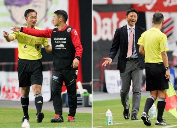 上:左側写真/後半22分、「あれはないんじゃないの?」とばかりに第4の審判に抗議する札幌の四方田修平監督