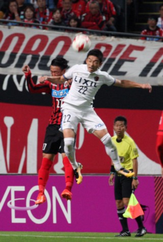 上写真/前半35分、GKからのロングボールをジャンプして競り合う札幌MF荒野(27番)と元札幌で鹿島DF西(22番)、共に札幌U−18の出身選手