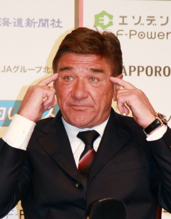 上写真/1月12日の就任会見でマイク持つのも忘れて熱く語るペトロヴィッチ新監督。プレミアホテル−TSUBAKI−札幌、撮影・石井一弘