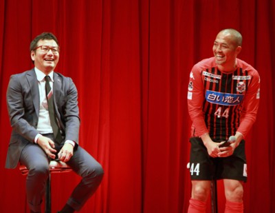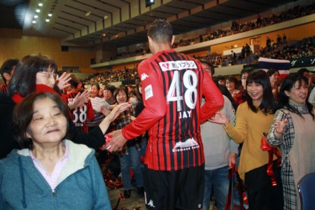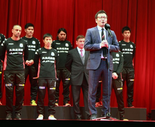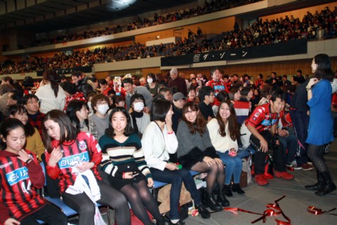 昨年の「キックオフ」は、アリーナにステージを設け、観覧席が入場者のシートだったが、今年はフロアにパイプ椅子を並べて多数のファンの便宜を図った。「北海道から 世界へ」の一端を見せたサポーターの意気込みがあった。ちなみに昨年は4千人―という。