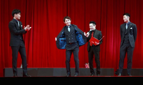 上写真/オフィシャルスーツの紹介で裏地を見せておどけるMF兵藤、左早坂、右DF横山