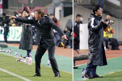 上:左側写真/後半20分、大きなジェスチャーで選手に指示を出す札幌のペトロビッチ監督、後方にC大阪の尹晶煥監督