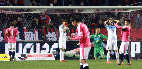 上写真/前半27分、C大阪のFW杉本に先制ゴールを決められガックリの選手たち。顔を覆うDFキム・ミンテ(20番)、両手を広げて嘆くGKク・ソンユン(25番)、手を頭にやるキャプテンMF宮澤(10番)。C大阪の選手は左端FW柿谷(8番)、ガッツポーズのDF木本(15番)、右端キャプテンMF山口