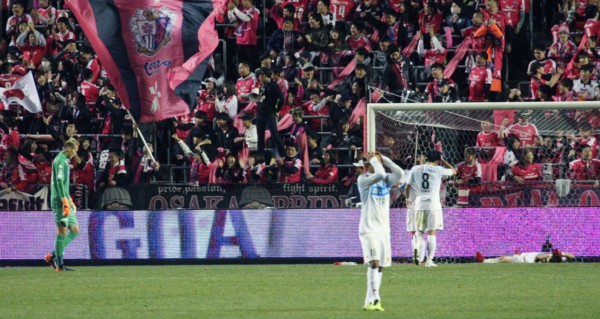 上写真/札幌が同点としたわずか3分後の後半27分、C大阪のエース柿谷に追加点を決められ肩を落とす札幌GKク・ソンユン(左端)、頭をかかえるMFチャナティップ(18番)、深井(8番)、ピッチに大の字となっているDFキム・ミンテ(右端)。ゴール裏のC大阪サポーターは大喜びだ