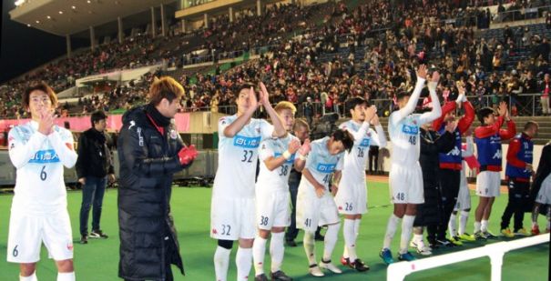上写真/強豪C大阪にアウエーで3−3と引き分け、サポーターにあいさつする札幌の選手たち