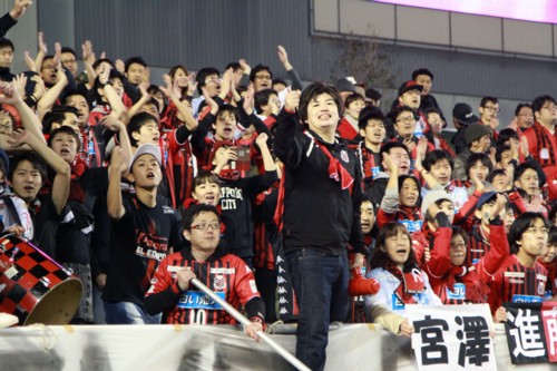 上写真/激しい展開の末、3−3と引き分けに持ち込んだC大阪戦タイムアップ後、選手たちを称える遠来の札幌のサポーターたち。表情も満足げだ